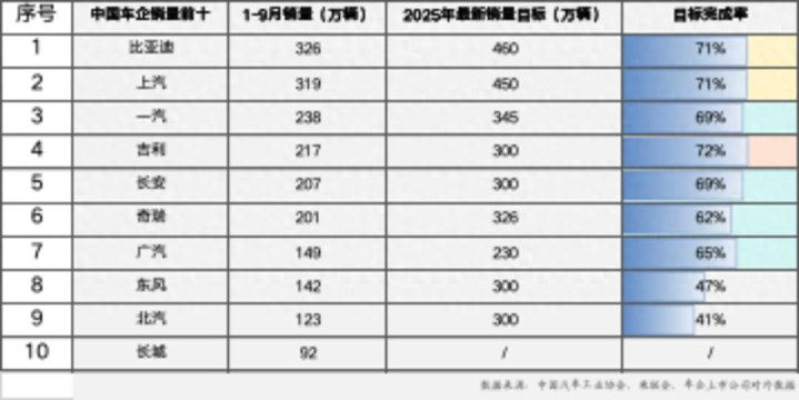 在200万辆级别的第二梯队中,竞争格局则更具看点,各家企业的发展路径与阶段性成果差异明显。吉利汽车无疑成为该梯队中的亮点,其前三季度累计销量达217万辆,以72%的全年目标完成率,在销量前十车企中高居榜首,被誉为第二梯队中的“增长标杆”。