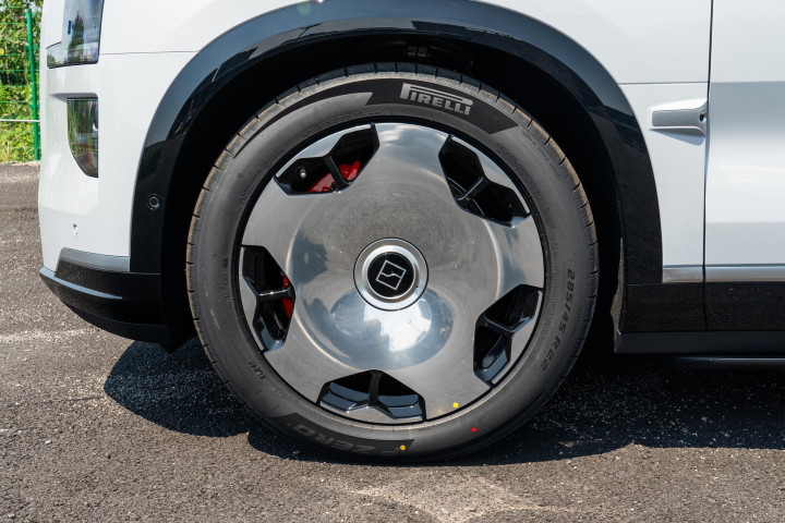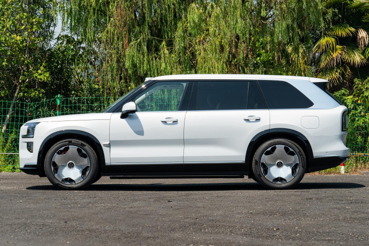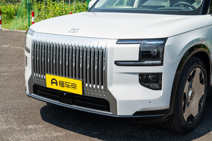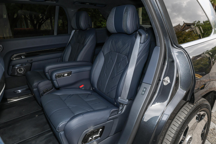 车侧给我的第一印象是非常平直的腰线,从A柱到C柱一气呵成,三根柱子统一做成黑色,与车顶融为一体,营造出悬浮车顶的视觉效果。22英寸镜面锻造轮毂上每一道切面都被打磨得反光均匀,无论是密条辐还是熏黑款式,都让我瞬间联想到劳斯莱斯库里南那种大气不凡。让我眼前一亮的是它的机械式门把手:虽然并非隐藏式设计,但在打开时依旧很顺畅,没有卡滞感,也符合日常使用习惯。