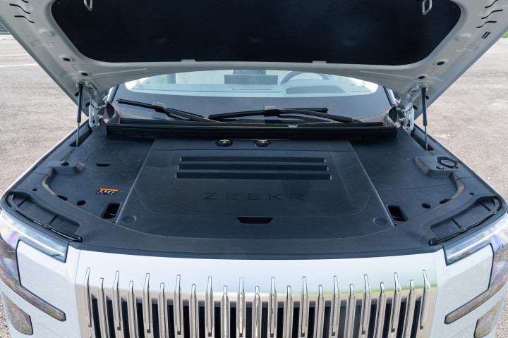 从第一次迈进展厅看到极氪9X的那一刻起,它那张与极氪009如出一辙的大尺寸直瀑式进气格栅和分体式大灯,让我一下子就能认出它的家族血统。前大灯采用双百万像素智能投影模组,不仅能在欢迎下车时弹出灯光秀,还能在行驶中配合辅助驾驶投射车道线,甚至在不妨碍驾驶的前提下,轻松切换为小型娱乐投影,让乘客在后排也能通过玻璃天窗欣赏一场小型光影表演。再加上SUV蚌式前舱盖,面积达2.15平方米,实打实的“脸面”效果,站在它前面,你能感受到极氪在细节和科技层面的用心。